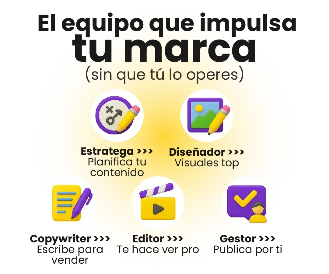 Tienes guiones listos, equipo ejecutando y publicaciones constantes. Ganas tiempo y energía mientras tu marca crece en piloto automático.