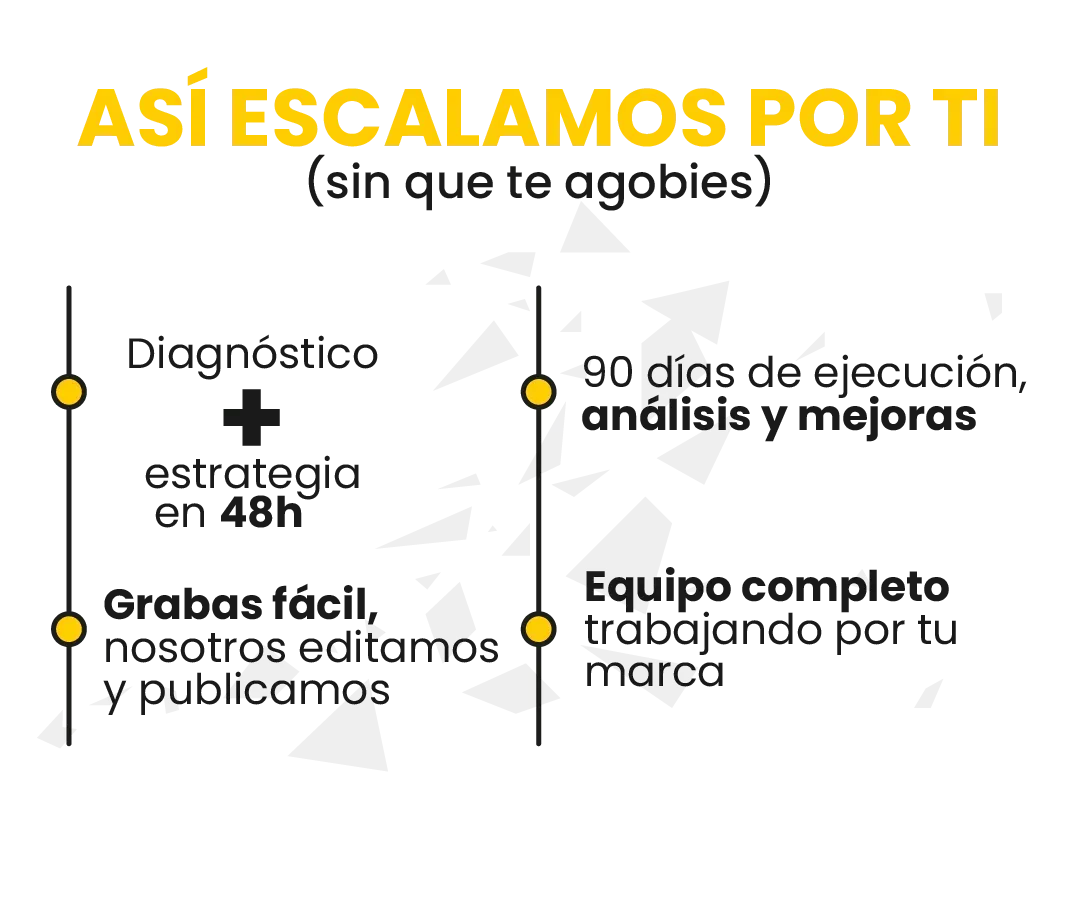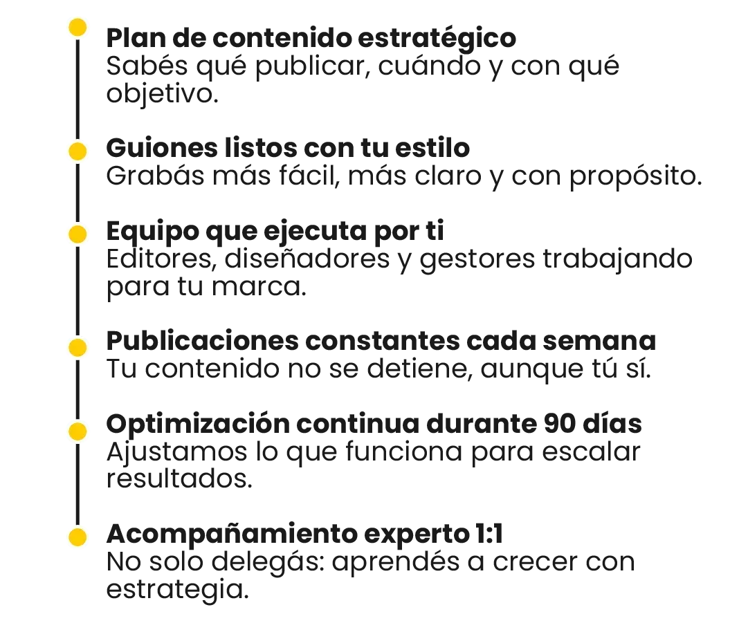 Tienes guiones listos, equipo ejecutando y publicaciones constantes. Ganas tiempo y energía mientras tu marca crece en piloto automático.